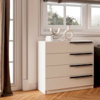 Комод «Айрон» — вместительный комод с четырьмя вместительными ящиками — универсальное решение, которое подойдёт и для спальни, и для домашнего кабинета, и для гостиной. Эргономичные черные ручки контрастного оттенка делают эту модель более изящной. Комод идеально подходит для хранения белья, одежды, аксессуаров, важных документов, украшений и мелочей. Верхнюю крышку можно использовать как дополнительную полочку для лампы.